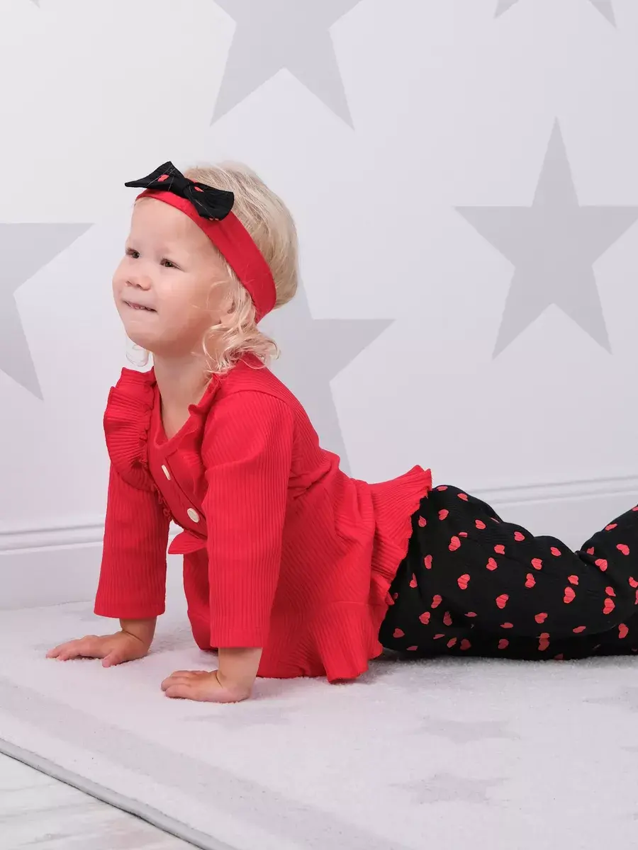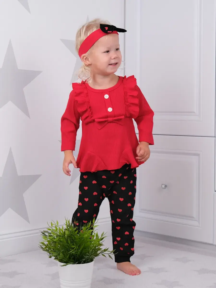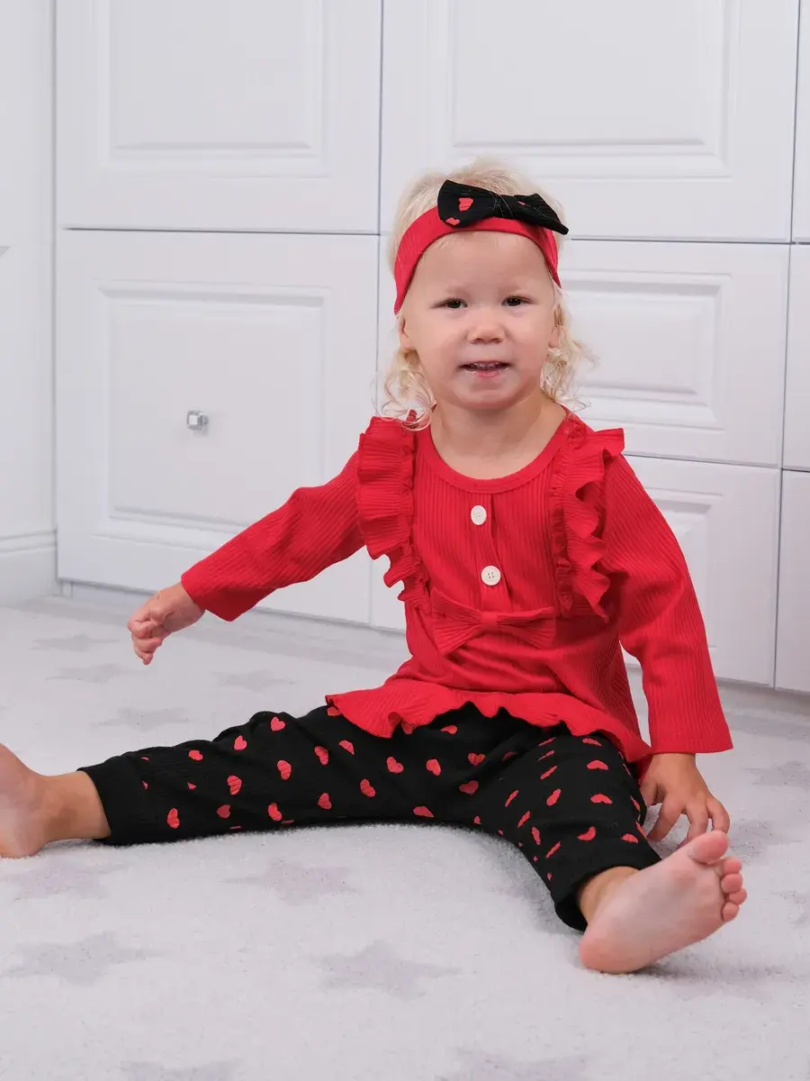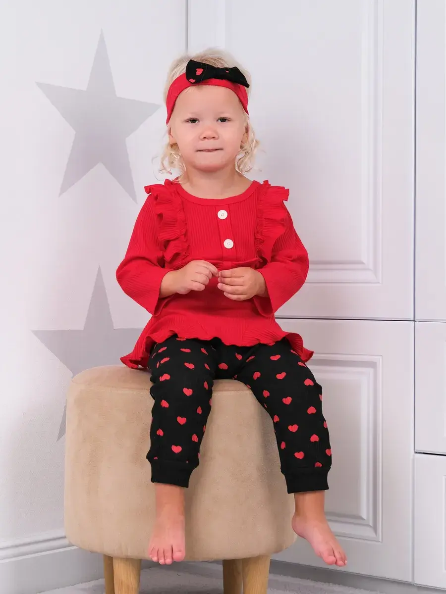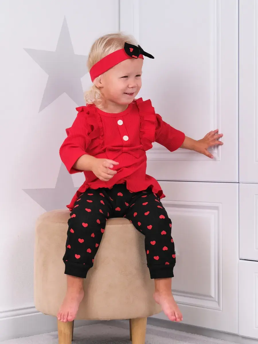 Модная одежда доступна в разных размерах, подходящих малышам от полугода до полутора лет. Яркие сердечки на ткани добавляют изюминку наряду, делая его популярным выбором среди родителей.