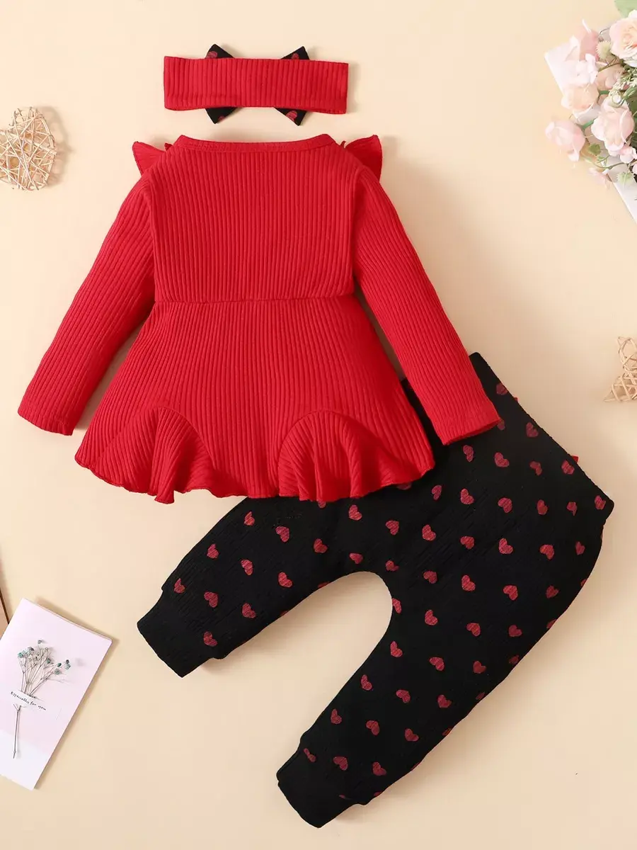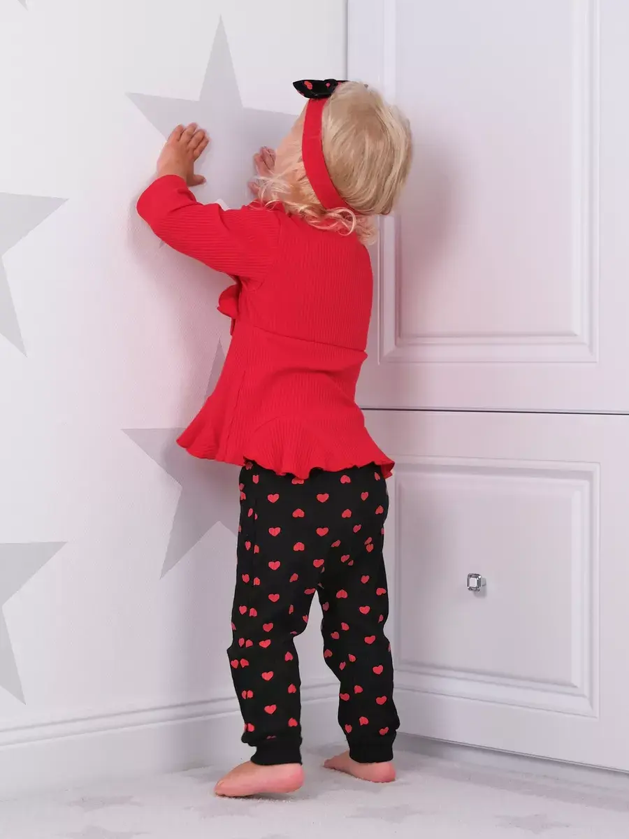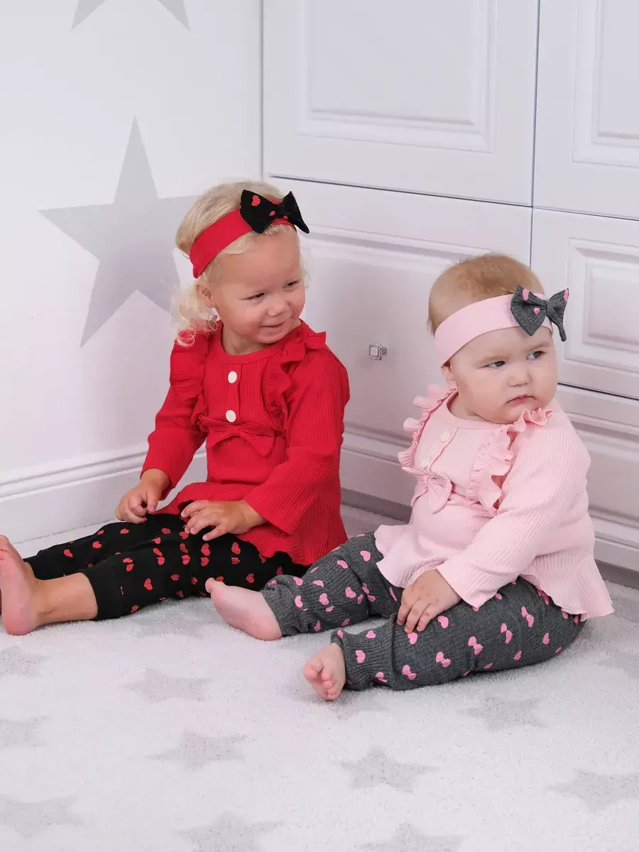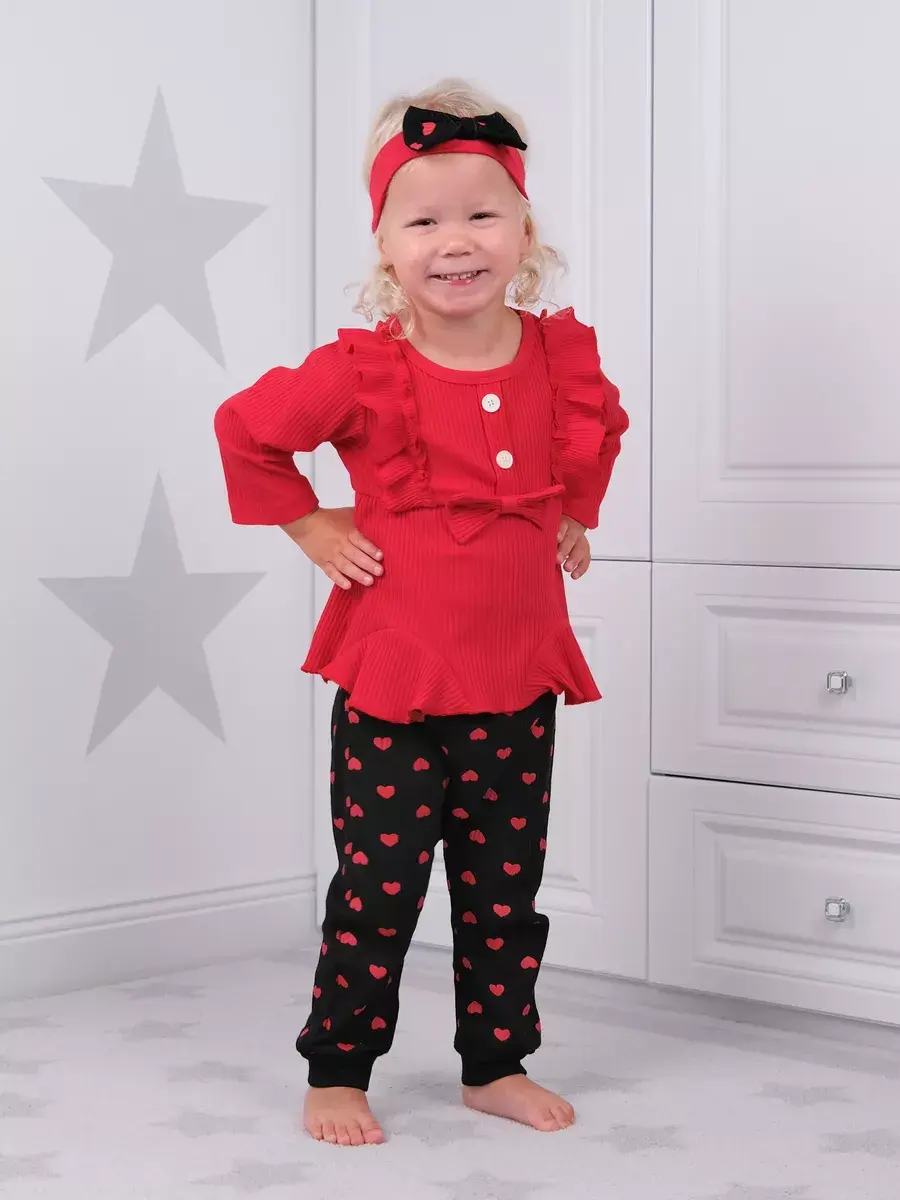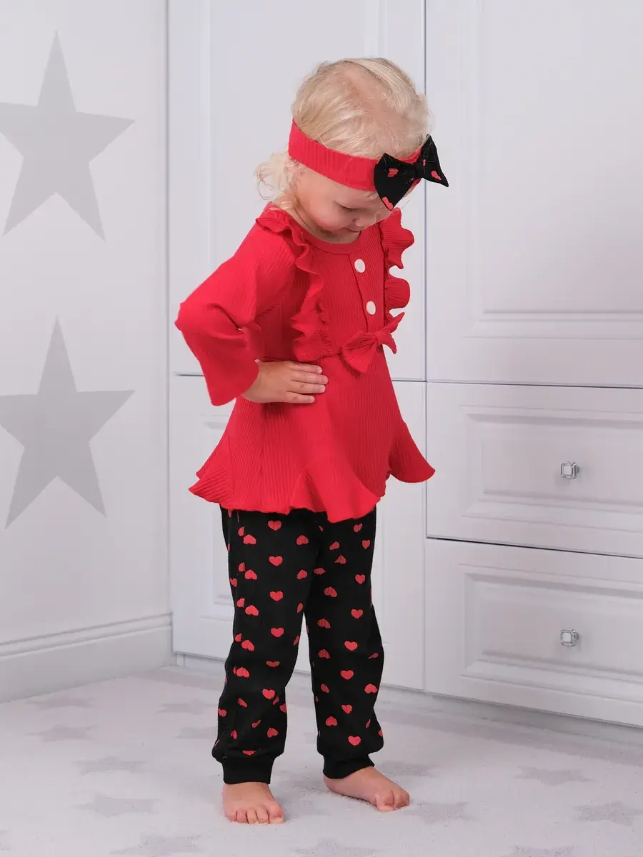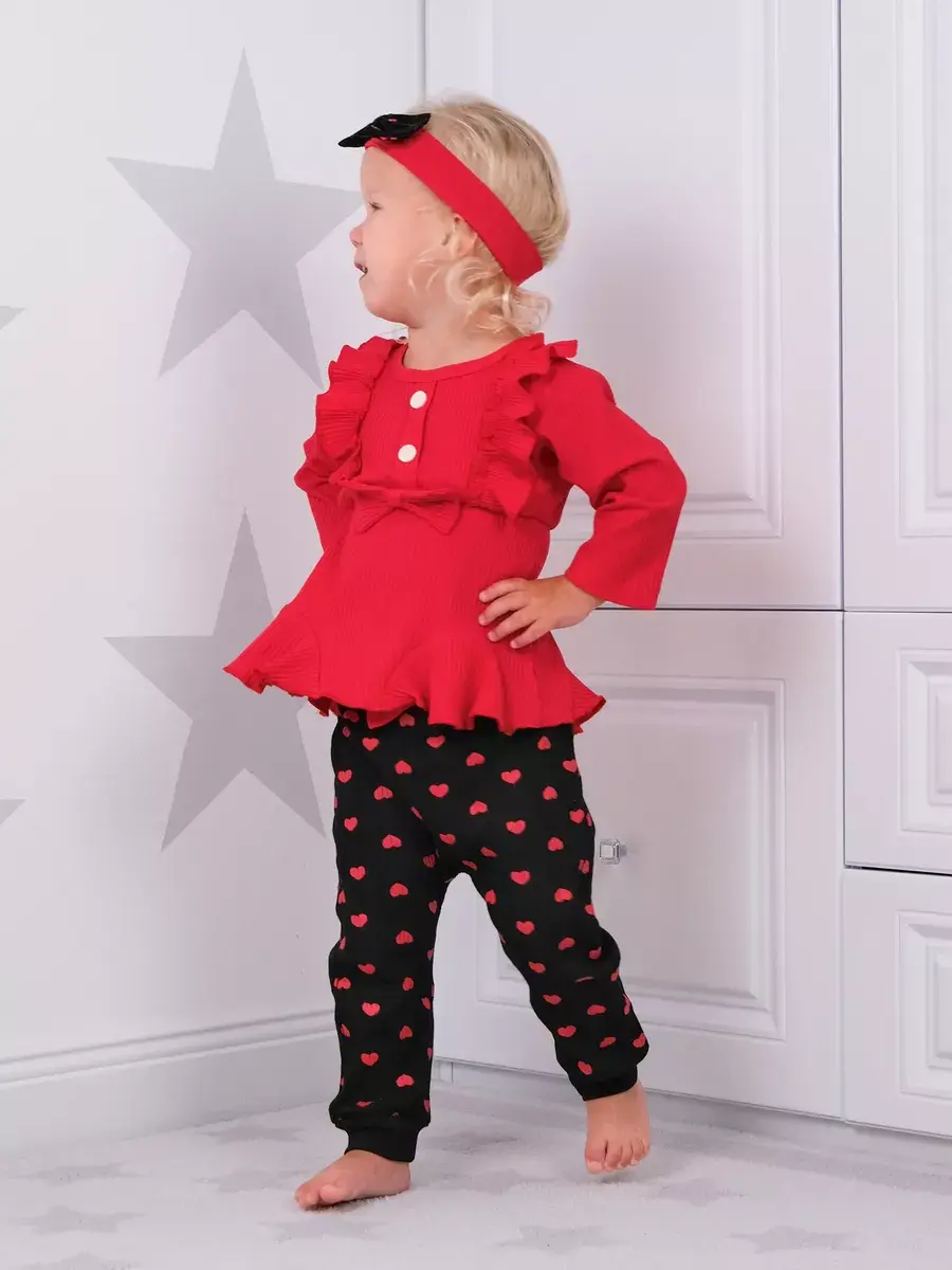 Модная одежда доступна в разных размерах, подходящих малышам от полугода до полутора лет. Яркие сердечки на ткани добавляют изюминку наряду, делая его популярным выбором среди родителей.