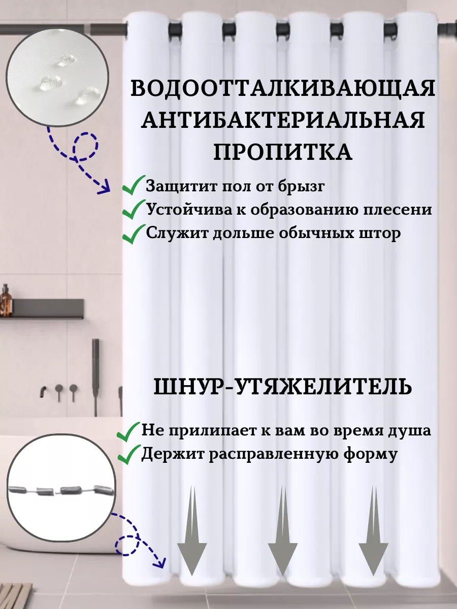 • Водоотталкивающая и водонепроницаемая: Забудьте о проблемах с плесенью и влагой! Наша штора защищает вашу ванну и душевую от нежелательной воды.
