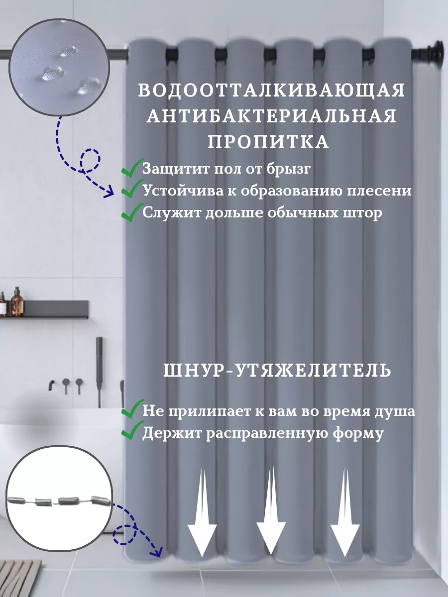 • Водоотталкивающая и водонепроницаемая: Забудьте о проблемах с плесенью и влагой! Наша штора защищает вашу ванну и душевую от нежелательной воды.