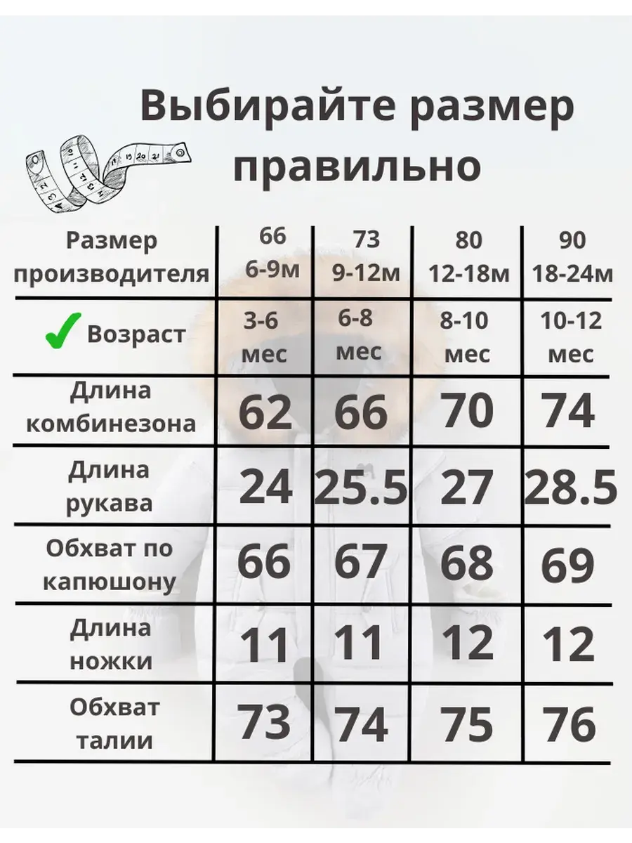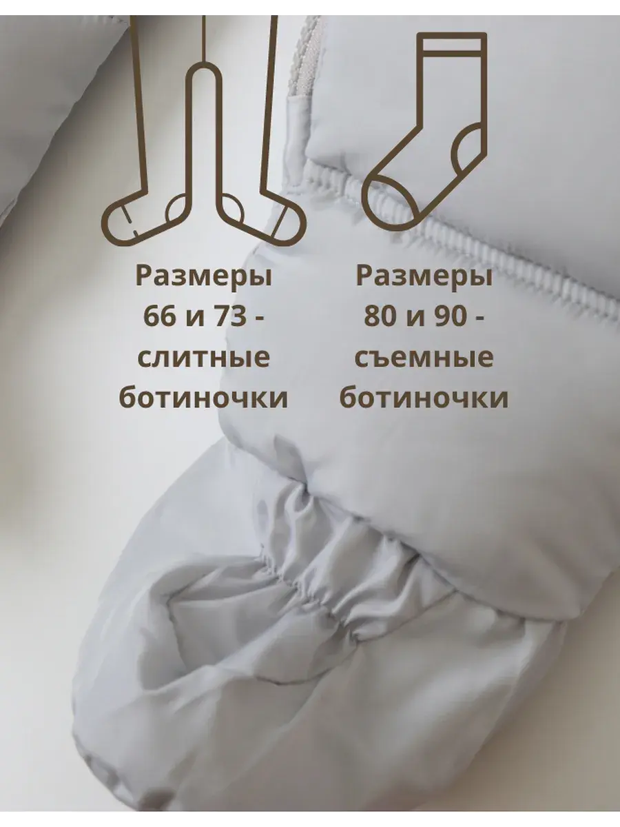 Зимний костюм подходит малышам возрастом от 3 месяцев до 1 года. На рост 66 и 73 см предусмотрены слитные ножки, а на больших размерах 80 и 90 см предусмотрены съемные пинетки – удобно использовать собственную обувь малыша. Теплые варежки на веревочке полностью закрывают ручки ребенка и не теряются.