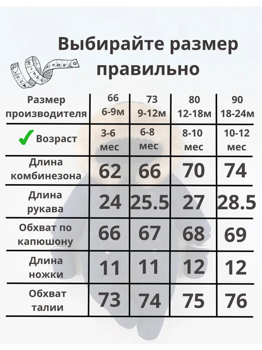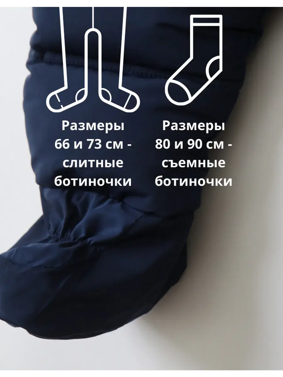 Зимний костюм подходит малышам возрастом от 3 месяцев до 1 года. На рост 66 и 73 см предусмотрены слитные ножки, а на больших размерах 80 и 90 см предусмотрены съемные пинетки – удобно использовать собственную обувь малыша. Теплые варежки на веревочке полностью закрывают ручки ребенка и не теряются.
